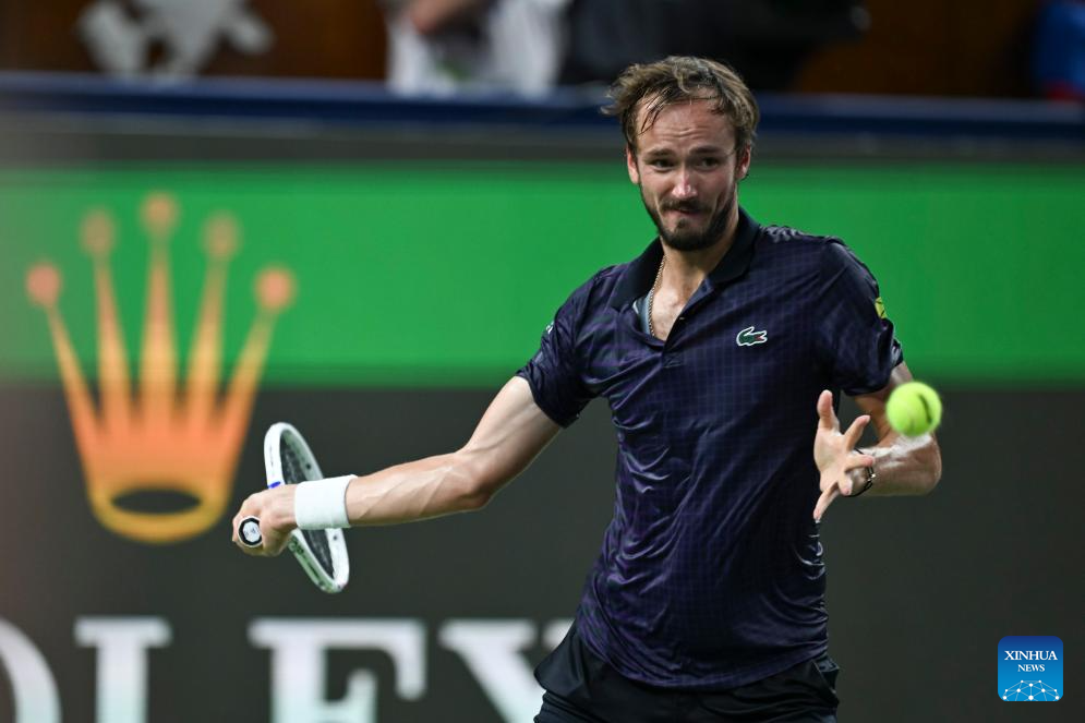 SHANGHAI, 10 octubre, 2025 (Xinhua) -- Daniil Medvedev devuelve la pelota durante los cuartos de final de individuales masculinos entre Daniil Medvedev, de Rusia, y Alex de Minaur, de Australia, en el torneo de tenis Masters de Shanghai del ATP World Tour, en Shanghai, en el este de China, el 10 de octubre de 2025. (Xinhua/Chen Haoming)