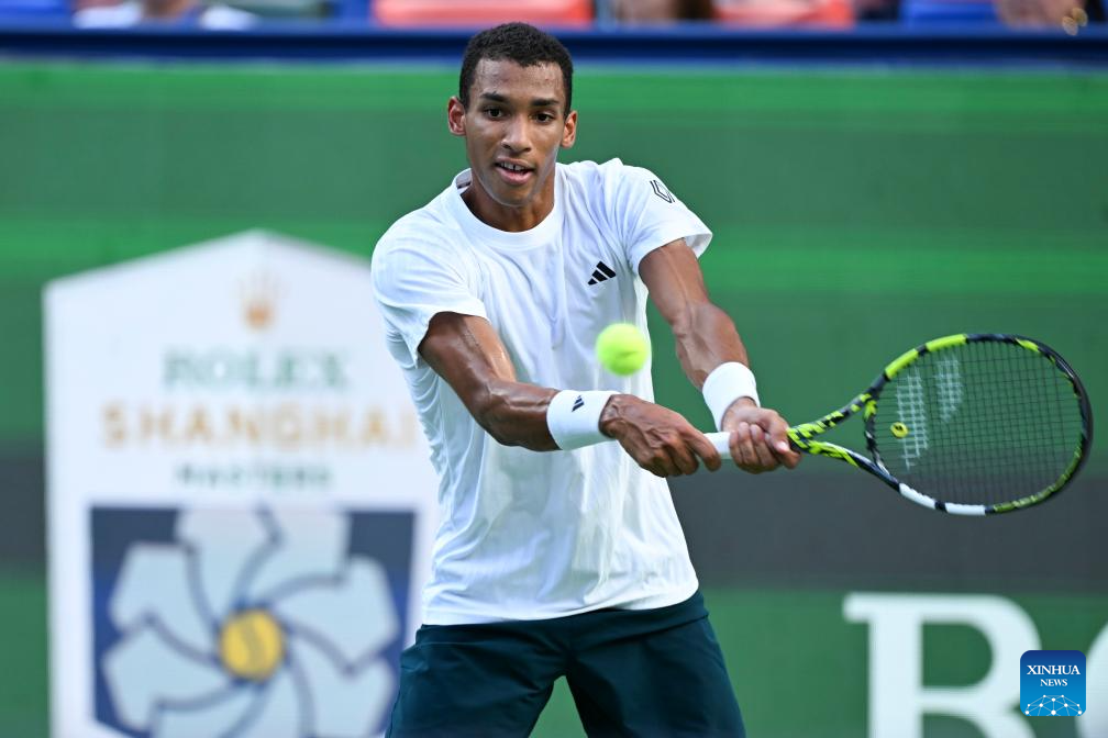 SHANGHAI, 10 octubre, 2025 (Xinhua) -- Felix Auger-Aliassime, de Canadá, devuelve la pelota a Arthur Rinderknech, de Francia, durante el partido de cuartos de final de individuales masculinos en el torneo de tenis Masters de Shanghai del ATP World Tour, en Shanghai, en el este de China, el 10 de octubre de 2025. (Xinhua/Chen Haoming)