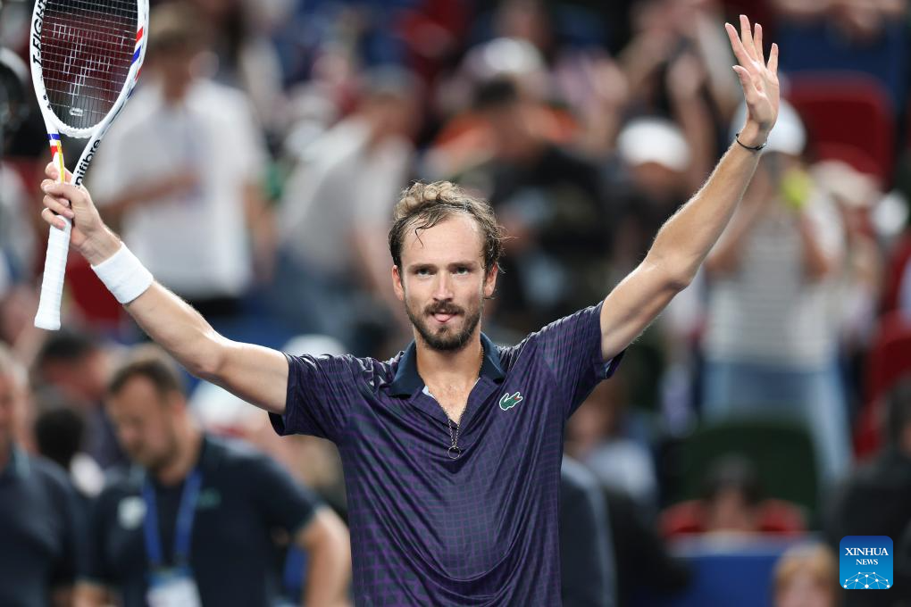 SHANGHAI, 10 octubre, 2025 (Xinhua) -- Daniil Medvedev reacciona al término de los cuartos de final de individuales masculinos entre Daniil Medvedev, de Rusia, y Alex de Minaur, de Australia, en el torneo de tenis Masters de Shanghai del ATP World Tour, en Shanghai, en el este de China, el 10 de octubre de 2025. (Xinhua/Wang Xiang)