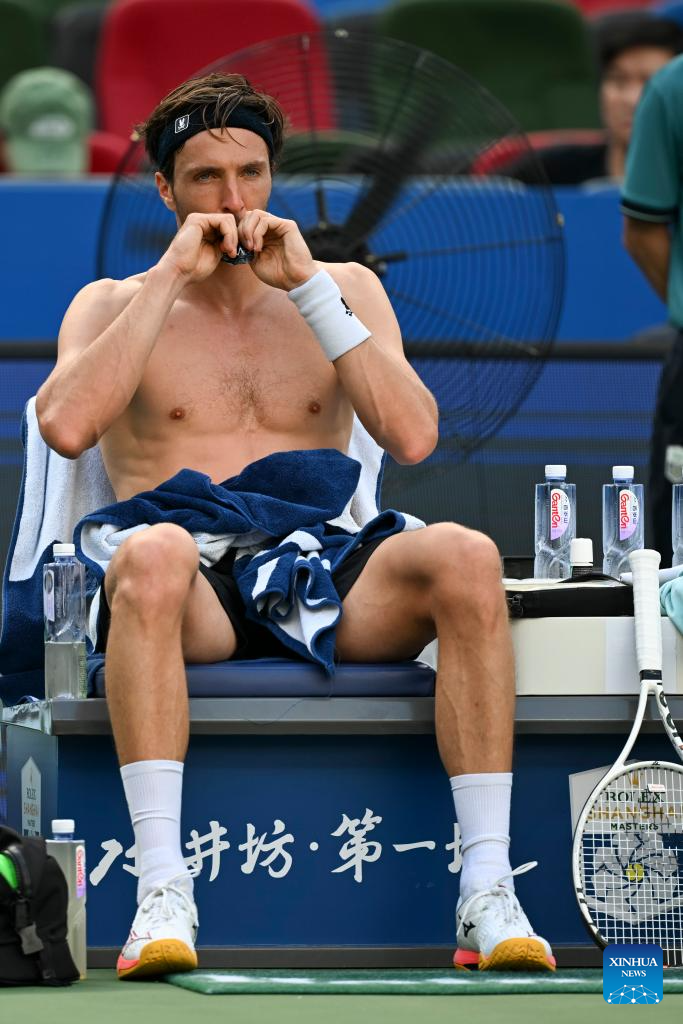 SHANGHAI, 10 octubre, 2025 (Xinhua) -- Arthur Rinderknech, de Francia, se toma un descanso mientras compite ante Felix Auger-Aliassime, de Canadá, durante el partido de cuartos de final de individuales masculinos en el torneo de tenis Masters de Shanghai del ATP World Tour, en Shanghai, en el este de China, el 10 de octubre de 2025. (Xinhua/Chen Haoming)