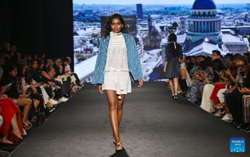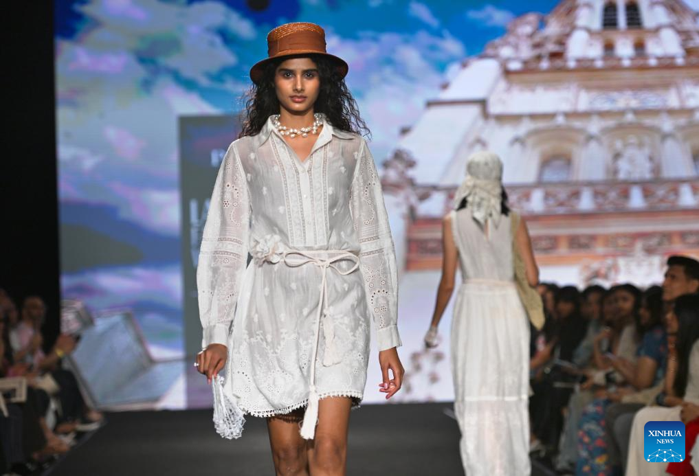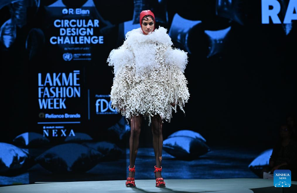 NUEVA DELHI, 11 octubre, 2025 (Xinhua) -- Imagen del 10 de octubre de 2025 de una modelo presentando una creación de la diseñadora italiana Martina Boero durante la Semana de la Moda Lakme x FDCI, en Nueva Delhi, India. (Xinhua/Javed Dar)