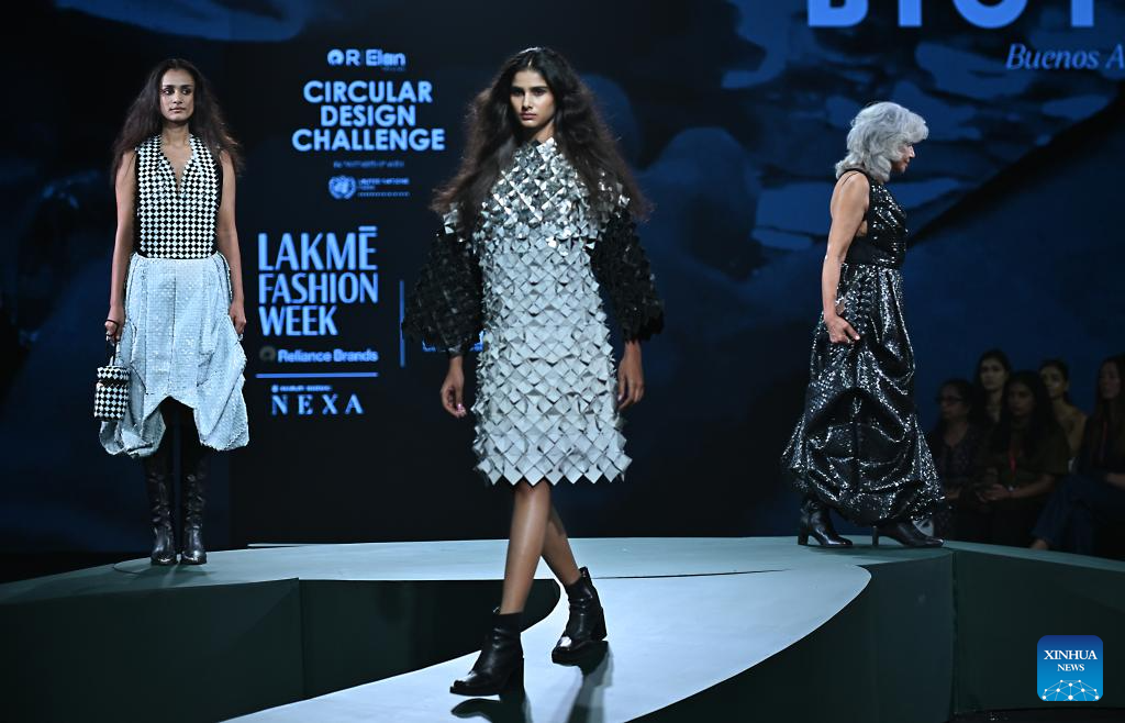 NUEVA DELHI, 11 octubre, 2025 (Xinhua) -- Imagen del 10 de octubre de 2025 de modelos presentando creaciones de la diseñadora Jesica Pullo de Buenos Aires durante la Semana de la Moda Lakme x FDCI, en Nueva Delhi, India. (Xinhua/Javed Dar)