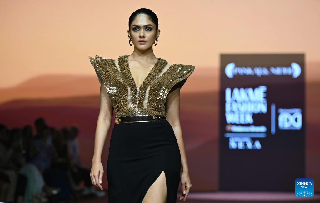 NUEVA DELHI, 11 octubre, 2025 (Xinhua) -- Imagen del 10 de octubre de 2025 de una modelo presentando una creación del diseñador británico Maximilian durante la Semana de la Moda Lakme x FDCI, en Nueva Delhi, India. (Xinhua/Javed Dar)