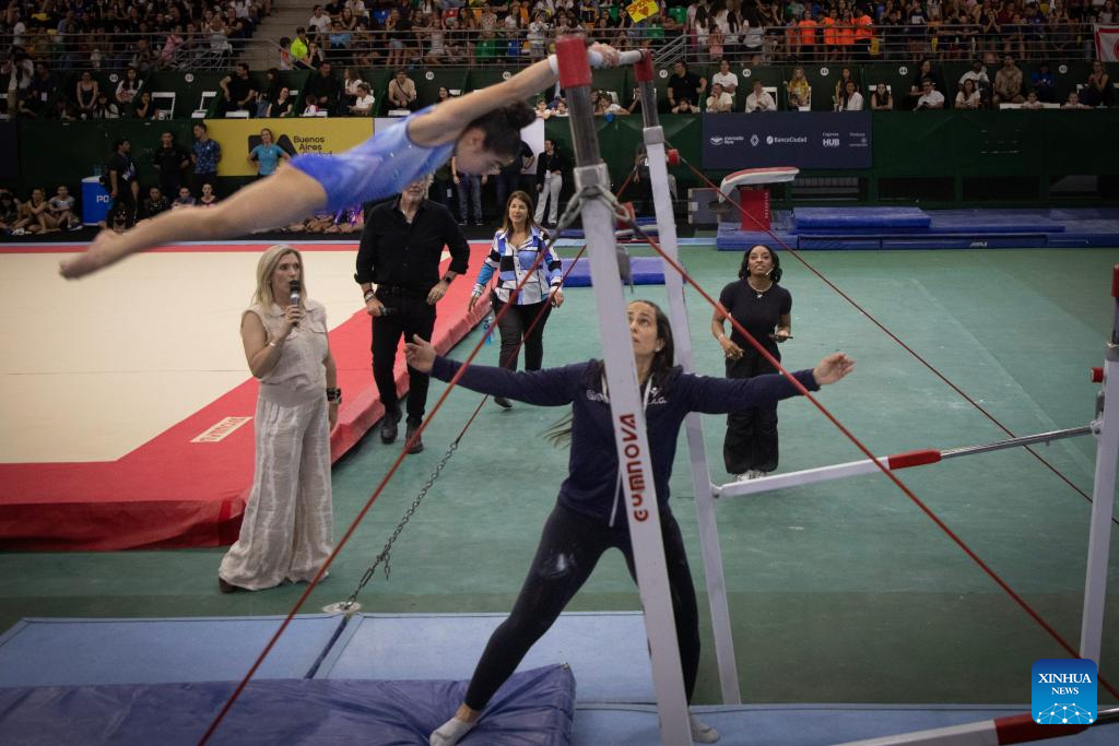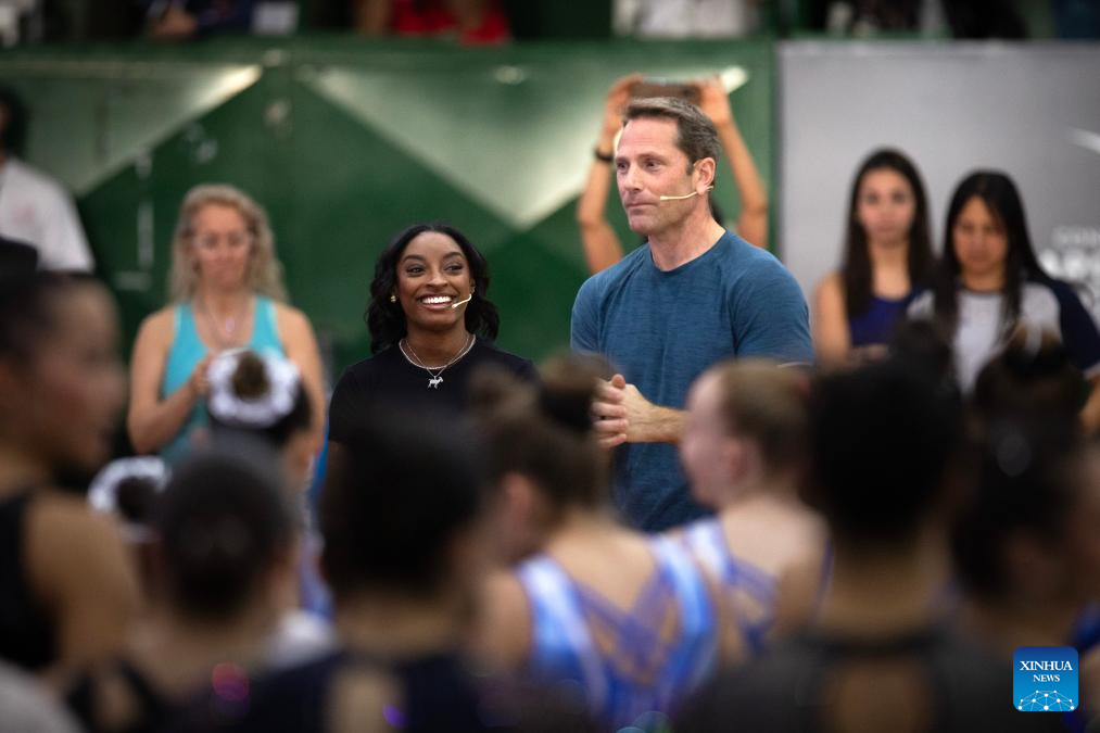 BUENOS AIRES, 10 octubre, 2025 (Xinhua) -- Imagen del 9 de octubre de 2025 de la gimnasta estadounidense, Simone Biles, participando durante una clínica de gimnasia en el estadio Mary Terán de Weiss, en la ciudad de Buenos Aires, capital de Argentina. (Xinhua/Martín Zabala)