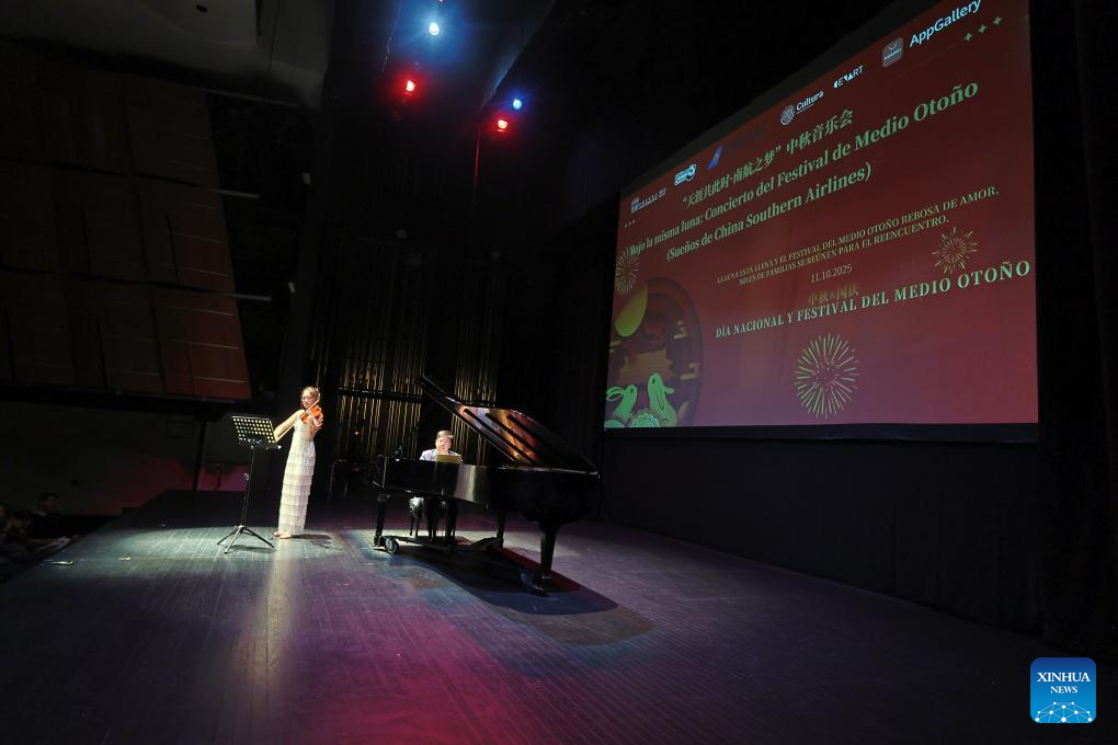 CIUDAD DE MEXICO, 12 octubre, 2025 (Xinhua) -- Imagen del 11 de octubre de 2025 de la violista Lu Jie realizando una presentación durante la gala "Bajo la misma luna: Concierto del Festival de Medio Otoño" en el CCentro Nacional de las Artes, en la Ciudad de México, capital de México. Entre melodías, colores y símbolos de luna llena, México celebró el sábado el Festival de Medio Otoño de China con un emotivo concierto de gala que reflejó la belleza y espiritualidad de una de las festividades más importantes del pueblo chino. (Xinhua/Alejandro Medina)