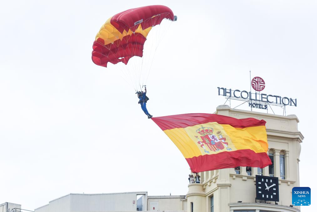 MADRID, 13 octubre, 2025 (Xinhua) -- Imagen del 12 de octubre de 2025 de un paracaidista mostrando la bandera nacional española durante un desfile militar conmemorativo por el Día Nacional, en Madrid, España. (Xinhua/Gustavo Valiente)