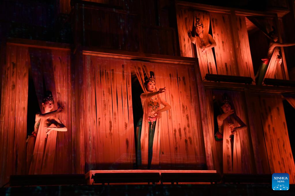 DUNHUANG, 15 octubre, 2025 (Xinhua) -- Actores realizan una presentación durante el drama inmersivo "Encore Dunhuang", en Dunhuang, en la provincia de Gansu, en el noroeste de China, el 15 de octubre de 2025. El drama inmersivo "Encore Dunhuang" muestra la historia, las costumbres y la cultura musical y dancística de Dunhuang. Este drama se ha representado más de 1.000 veces este año, atrayendo a más de 500.000 espectadores. (Xinhua/Fan Peishen)
