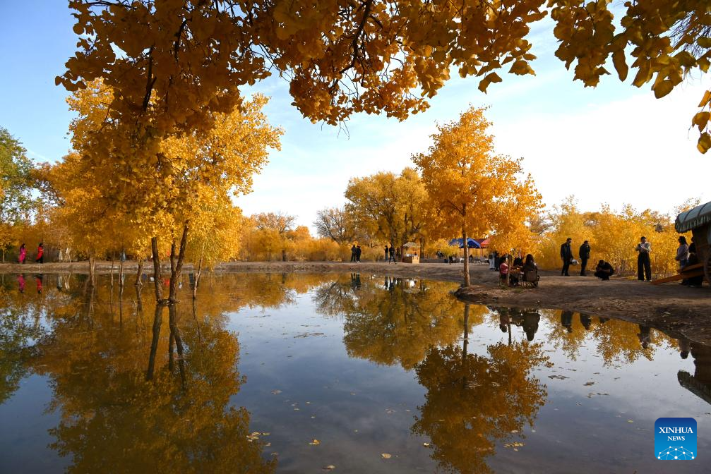 DUNHUANG, 15 octubre, 2025 (Xinhua) -- Imagen del 14 de octubre de 2025 de turistas disfrutando del paisaje en un bosque de Populus euphratica, en la ciudad de Dunhuang, en la provincia de Gansu, en el noroeste de China. (Xinhua/Zhang Xiaoliang)