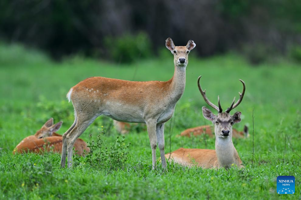 HAIKOU, 16 octubre, 2025 (Xinhua) -- Imagen del 27 de mayo de 2024 de un ciervo de Eld de Hainan en la reserva natural provincial de Bangxi, en el distrito autónomo li de Baisha, en la provincia de Hainan, en el sur de China. Este octubre se celebra el cuarto aniversario del Parque Nacional de la Selva Tropical de Hainan. Durante los últimos cuatro años, este vasto ecosistema ha presentado un excelente "informe ecológico", que muestra el notable progreso de China en la conservación de la biodiversidad y la restauración del hábitat. (Xinhua/ La administración del Parque Nacional de la Selva Tropical de Hainan)