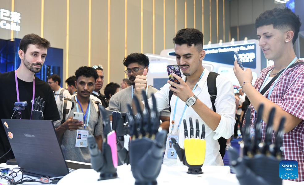 GUANGZHOU, 16 octubre, 2025 (Xinhua) -- Imagen del 15 de octubre de 2025 de compradores extranjeros interactuando con manos robóticas en la Zona de Robots de Servicio durante la 138ª edición de la Feria de Importación y Exportación de China (Feria de Cantón), en Guangzhou, en la provincia de Guangdong, en el sur de China. La feria destaca la Zona de Robots de Servicio para mostrar innovaciones de vanguardia, como robots humanoides, robots exoesqueleto, robots de patrullaje esféricos, robots de limpieza fotovoltaicos, robots educativos, etc. (Xinhua/Deng Hua)
