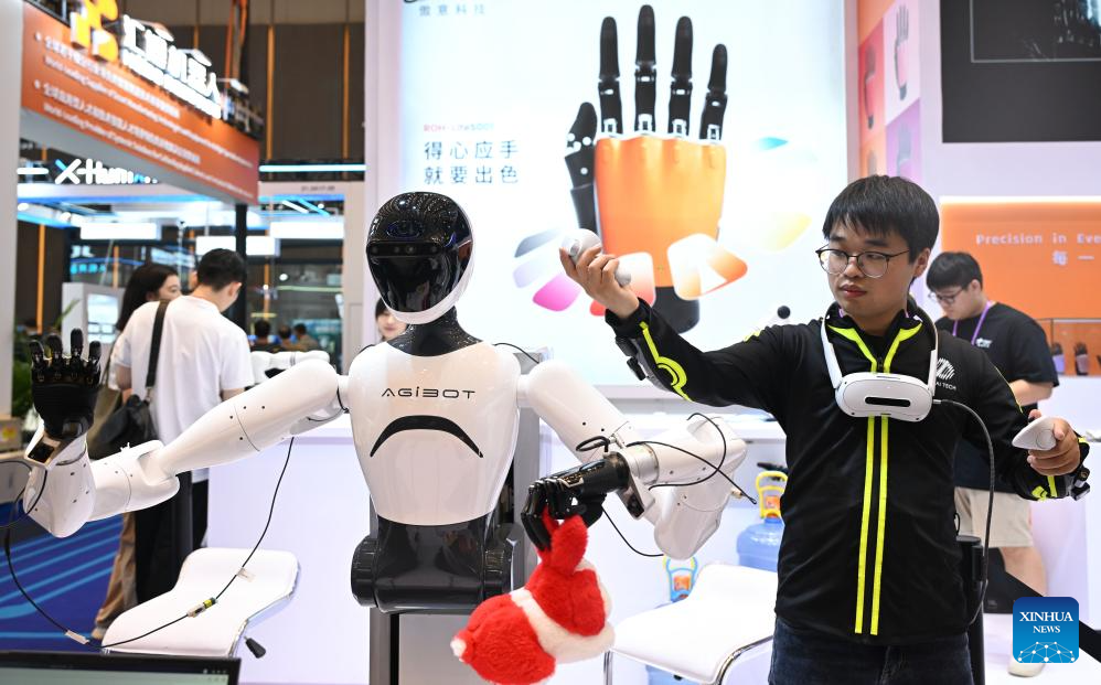 GUANGZHOU, 16 octubre, 2025 (Xinhua) -- Imagen del 15 de octubre de 2025 de un expositor demostrando un robot que se sincroniza con sus movimientos en la Zona de Robots de Servicio durante la 138ª edición de la Feria de Importación y Exportación de China (Feria de Cantón), en Guangzhou, en la provincia de Guangdong, en el sur de China. La feria destaca la Zona de Robots de Servicio para mostrar innovaciones de vanguardia, como robots humanoides, robots exoesqueleto, robots de patrullaje esféricos, robots de limpieza fotovoltaicos, robots educativos, etc. (Xinhua/Deng Hua)