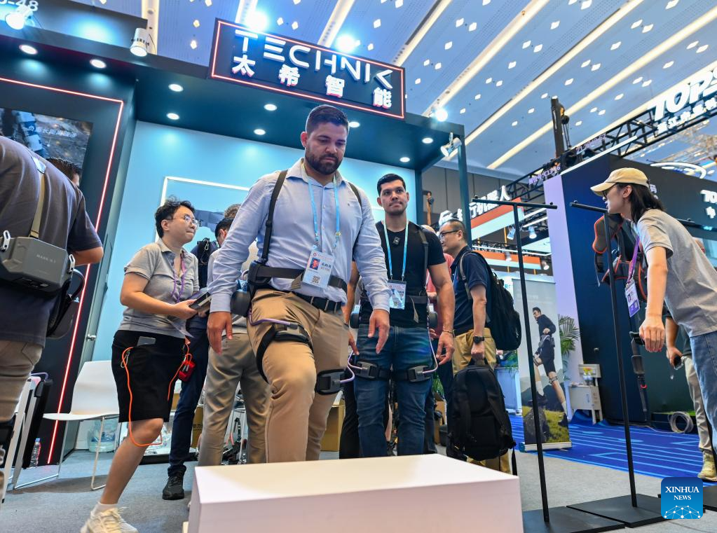 GUANGZHOU, 16 octubre, 2025 (Xinhua) -- Imagen del 15 de octubre de 2025 de un comprador extranjero probando un robot exoesqueleto para escalada de montaña en el estand de Hangzhou Technik Technology Co., Ltd. en la Zona de Robots de Servicio durante la 138ª edición de la Feria de Importación y Exportación de China (Feria de Cantón), en Guangzhou, en la provincia de Guangdong, en el sur de China. La feria destaca la Zona de Robots de Servicio para mostrar innovaciones de vanguardia, como robots humanoides, robots exoesqueleto, robots de patrullaje esféricos, robots de limpieza fotovoltaicos, robots educativos, etc. (Xinhua/Xiao Ennan)