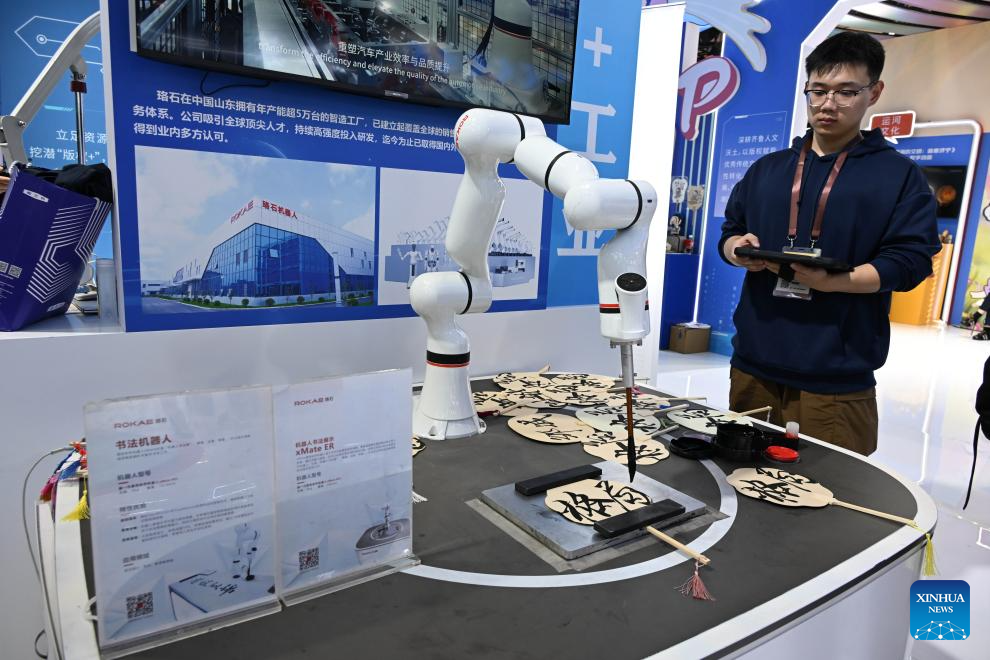 QINGDAO, 16 octubre, 2025 (Xinhua) -- Un expositor opera un robot de caligrafía en la décima Exposición Internacional de los Derechos de Autor de China, en Qingdao, en la provincia de Shandong, en el este de China, el 16 de octubre de 2025. Con el tema "La Inteligencia Digital Lidera el Futuro, los Derechos de Autor Promueven el Desarrollo Innovador", la décima Exposición Internacional de los Derechos de Autor de China y el Foro Internacional de los Derechos de Autor 2025 se inauguraron el jueves en Qingdao. (Xinhua/Li Ziheng)