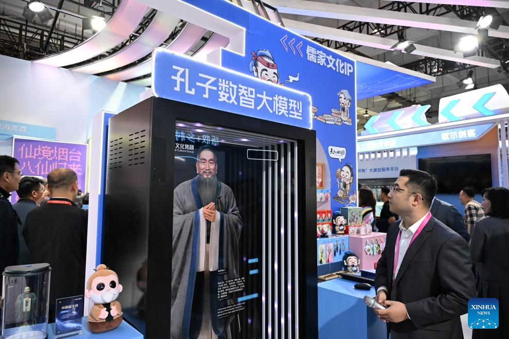 QINGDAO, 16 octubre, 2025 (Xinhua) -- Un asistente observa una imagen de inteligencia digital de Confucio en la décima Exposición Internacional de los Derechos de Autor de China, en Qingdao, en la provincia de Shandong, en el este de China, el 16 de octubre de 2025. Con el tema "La Inteligencia Digital Lidera el Futuro, los Derechos de Autor Promueven el Desarrollo Innovador", la décima Exposición Internacional de los Derechos de Autor de China y el Foro Internacional de los Derechos de Autor 2025 se inauguraron el jueves en Qingdao. (Xinhua/Li Ziheng)