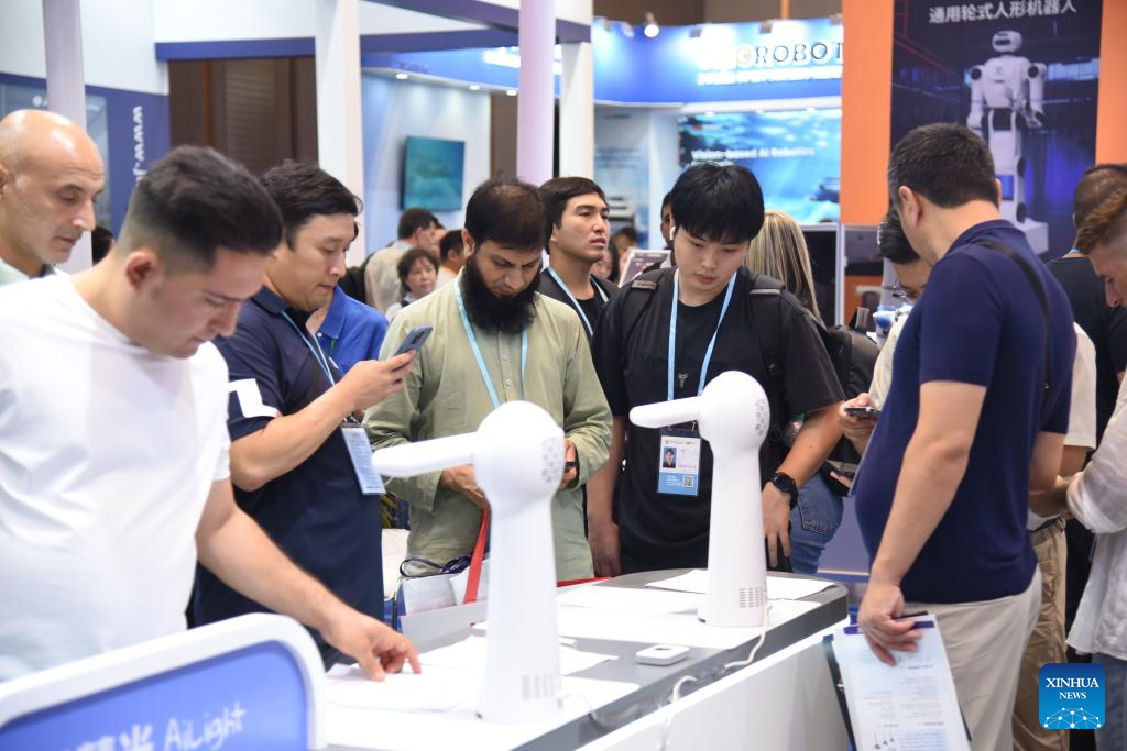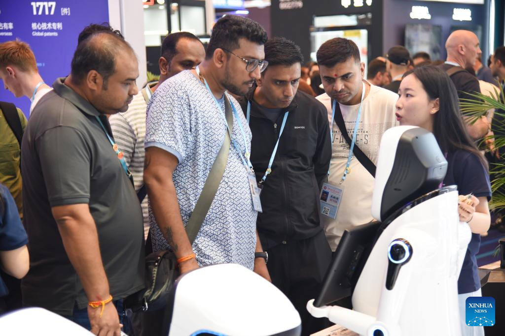 GUANGZHOU, 17 octubre, 2025 (Xinhua) -- Imagen del 16 de octubre de 2025 de compradores internacionales aprendiendo sobre los robots de servicio durante la 138ª edición de la Feria de Importación y Exportación de China, también conocida como Feria de Cantón, en Guangzhou, en la provincia de Guangdong, en el sur de China. La feria comenzó el miércoles con más 32.000 expositores, lo que supone un récord histórico. (Xinhua/Hong Zehua)
