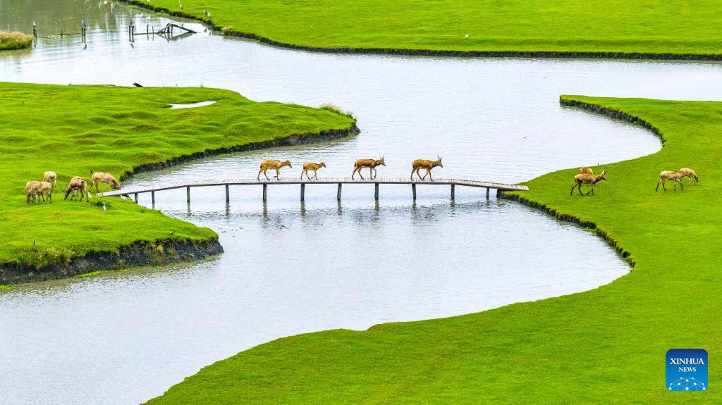 BEIJING, 18 octubre, 2025 (Xinhua) -- Vista aérea tomada con un dron el 17 de octubre de 2025 de una manada de ciervos milu cruzando un río en un parque de humedales, en el distrito de Jiangyan, en la ciudad de Taizhou, en la provincia de Jiangsu, en el este de China. (Xinhua/Zhou Shegen)