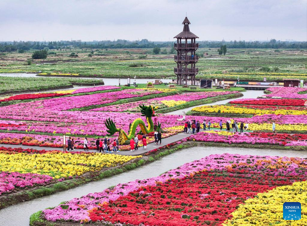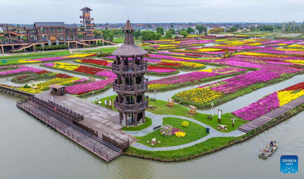 BEIJING, 18 octubre, 2025 (Xinhua) -- Vista aérea tomada con un dron de turistas visitando un área escénica, en Xinghua, en la provincia de Jiangsu, en el este de China, el 18 de octubre de 2025. (Xinhua/Gu Jihong)