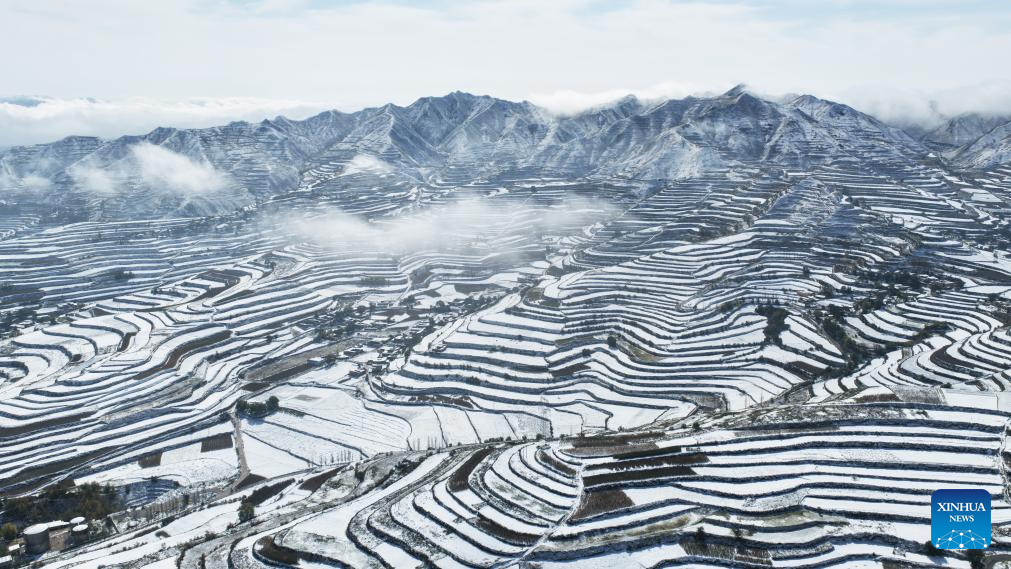 BEIJING, 18 octubre, 2025 (Xinhua) -- Vista aérea tomada con un dron el 17 de octubre de 2025 de campos en terrazas cubiertos de nieve, en el poblado de Chenjing, en el condado de Yongjing, en la provincia de Gansu, en el noroeste de China. (Xinhua/Shi Youdong)