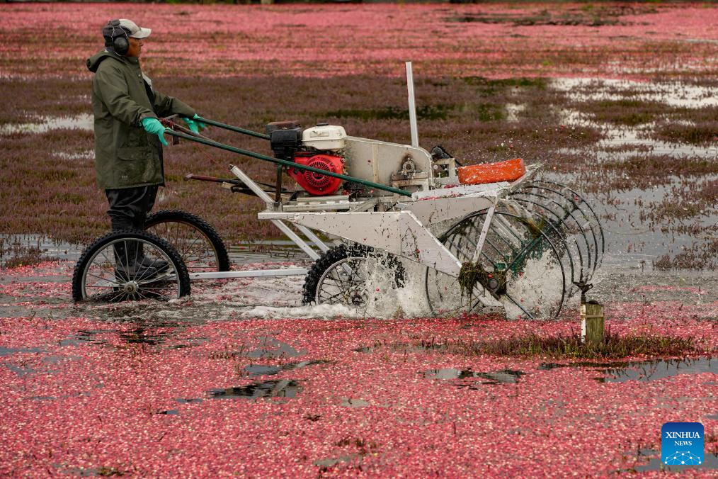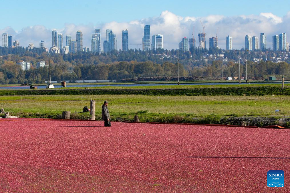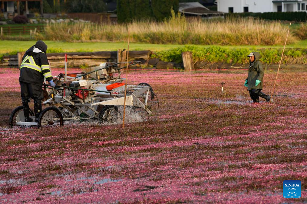 RICHMOND, 18 octubre, 2025 (Xinhua) -- Imagen del 17 de octubre de 2025 de un trabajador vadeando entre arándanos flotantes en una granja de arándanos, en Richmond, Columbia Británica, Canadá. Richmond es una de las principales áreas productoras de arándanos de Canadá, donde la cosecha suele extenderse desde finales de septiembre hasta principios de noviembre. (Xinhua/Liang Sen)