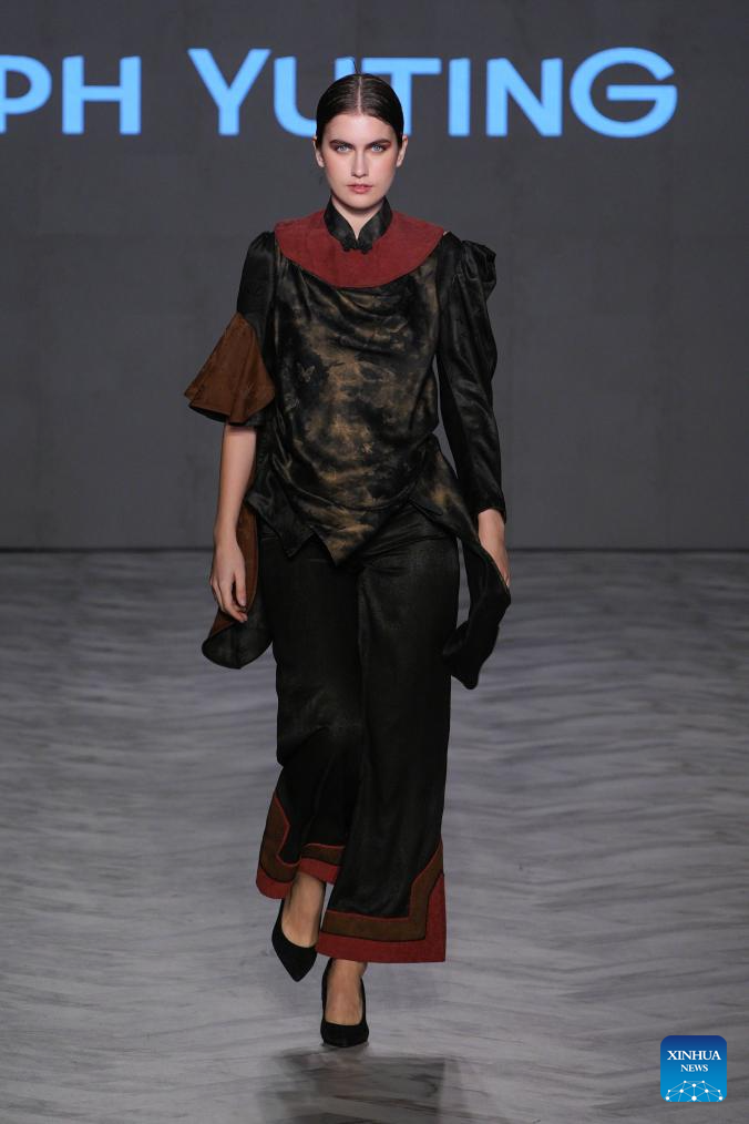 VANCOUVER, 19 octubre, 2025 (Xinhua) -- Imagen del 18 de octubre de 2025 de una modelo presentando una creación de la marca china de Jeph Yuting durante el desfile de las colecciones Primavera/Verano 2026 en la Semana de la Moda de Vancouver, en Vancouver, Columbia Británica, Canadá. (Xinhua/Liang Sen)