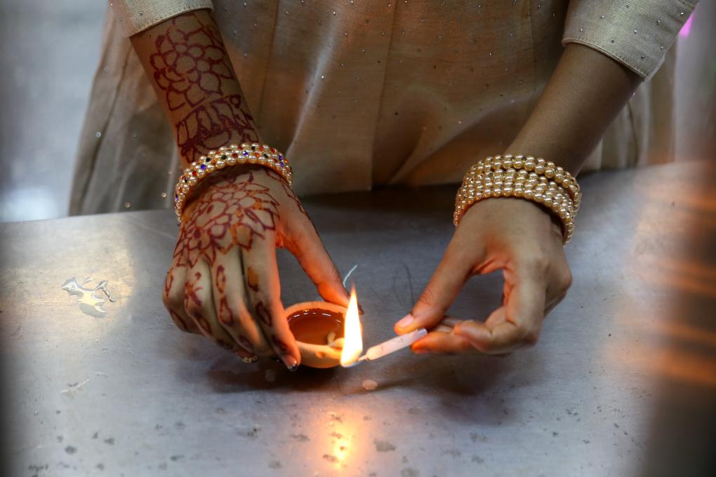 YANGON, 20 octubre, 2025 (Xinhua) -- Una mujer enciende una lámpara de aceite para celebrar el Diwali, o festival hindú de las luces, en Yangón, Myanmar, el 20 de octubre de 2025. (Xinhua/Myo Kyaw Soe)