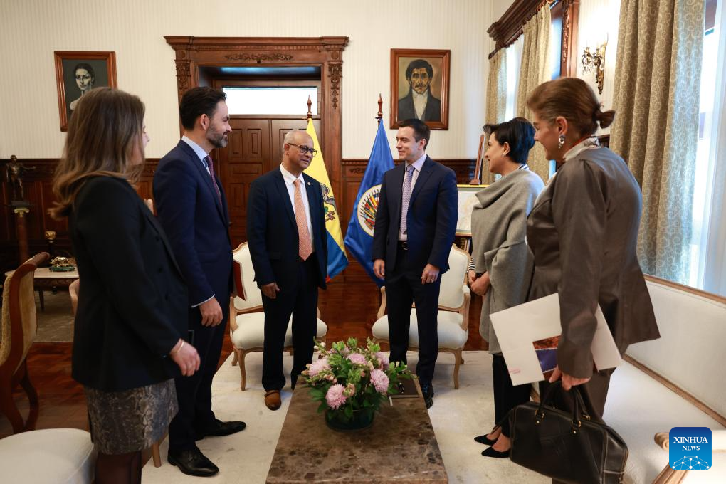 QUITO, 20 octubre, 2025 (Xinhua) -- Imagen proveída por la Presidencia de Ecuador del presidente ecuatoriano, Daniel Noboa (3-d), conversando con el secretario general de la Organización de los Estados Americanos (OEA), Albert Ramdin (3-i), durante su reunión oficial, en el Palacio de Carondelet, en Quito, capital de Ecuador, el 20 de octubre de 2025. Ramdin firmó el lunes un acuerdo de cooperación técnica en seguridad con Ecuador durante su primera visita oficial al país sudamericano, en la que se reunió con el presidente, Daniel Noboa, y autoridades del Gobierno, informó el Ministerio de Relaciones Exteriores y Movilidad Humana. (Xinhua/Isaac Castillo/Presidencia de Ecuador)