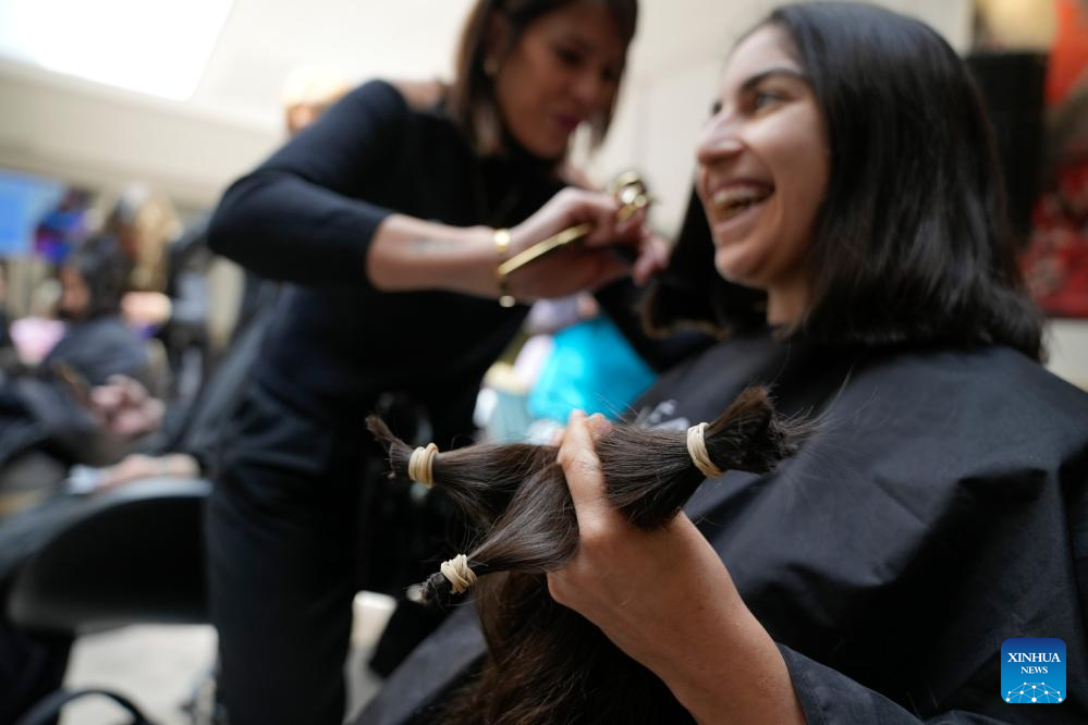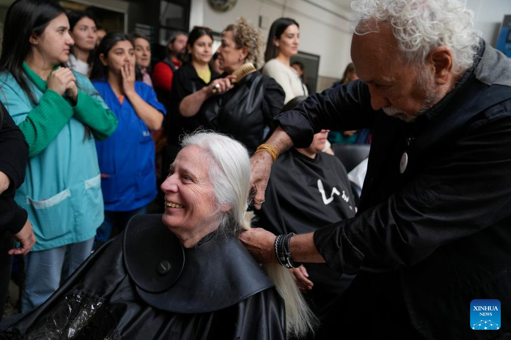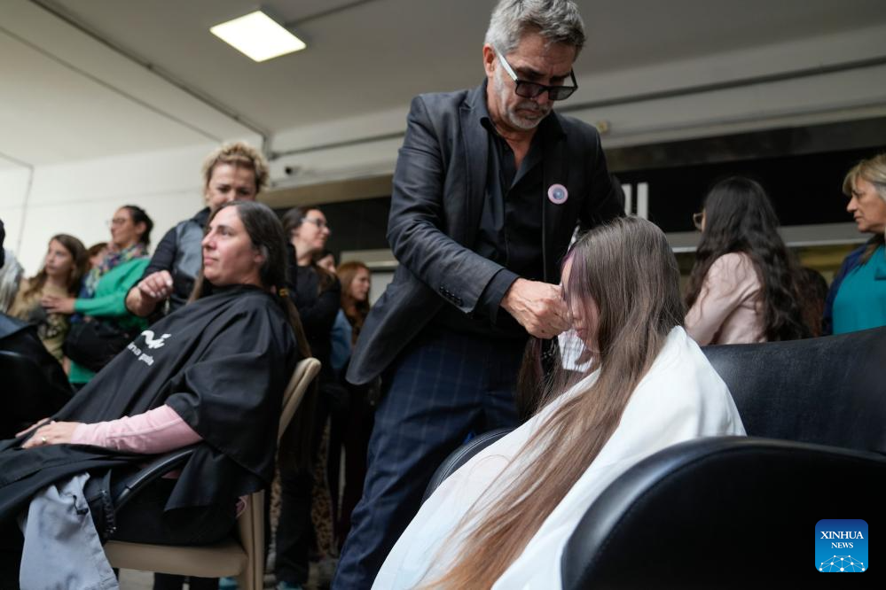 MONTEVIDEO, 20 octubre, 2025 (Xinhua) -- Una peluquera realiza un corte de cabello a una mujer durante una jornada de donación de cabello a beneficio de la confección de accesorios y pelucas para mujeres en tratamiento oncológico en ocasión del Día Mundial de Lucha contra el Cáncer de Mama, en Montevideo, capital de Uruguay, el 20 de octubre de 2025. (Xinhua/Nicolás Celaya)