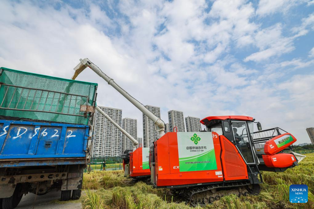 HANGZHOU, 21 octubre, 2025 (Xinhua) -- Una cosechadora carga el arroz cosechado a un camión, en Hangzhou, en la provincia de Zhejiang, en el este de China, el 21 de octubre de 2025. (Xinhua/Xu Yu)