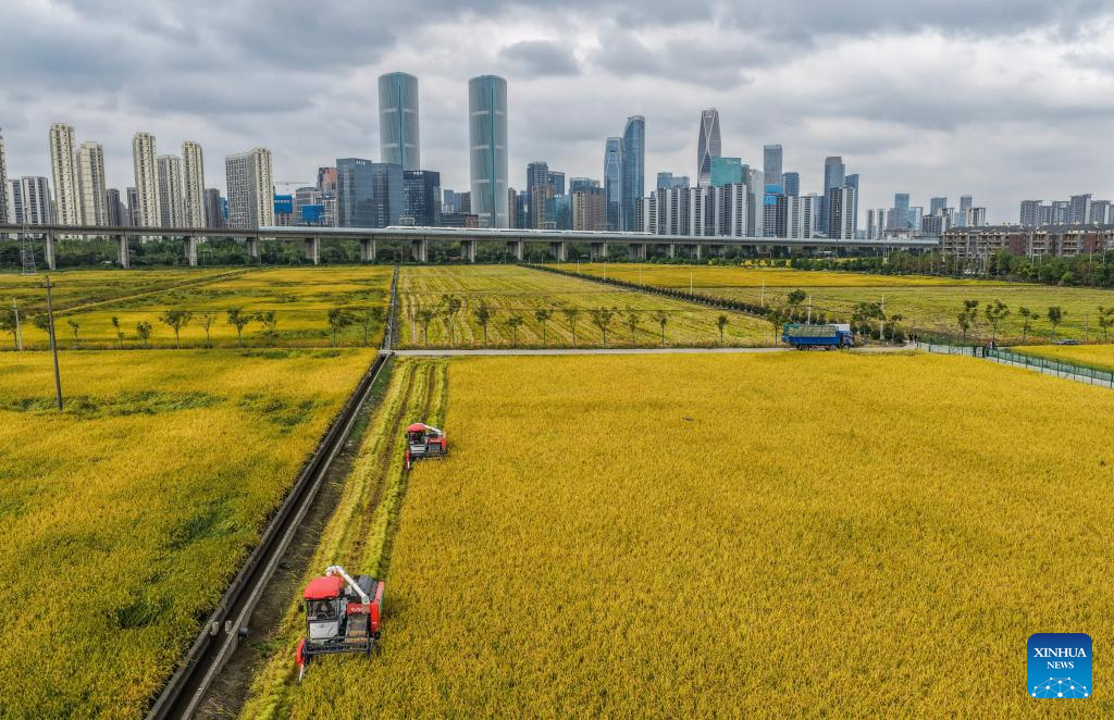 HANGZHOU, 21 octubre, 2025 (Xinhua) -- Imagen tomada con un dron el 21 de octubre de 2025 de cosechadoras recolectando arroz en un arrozal, en Hangzhou, en la provincia de Zhejiang, en el este de China. (Xinhua/Xu Yu)