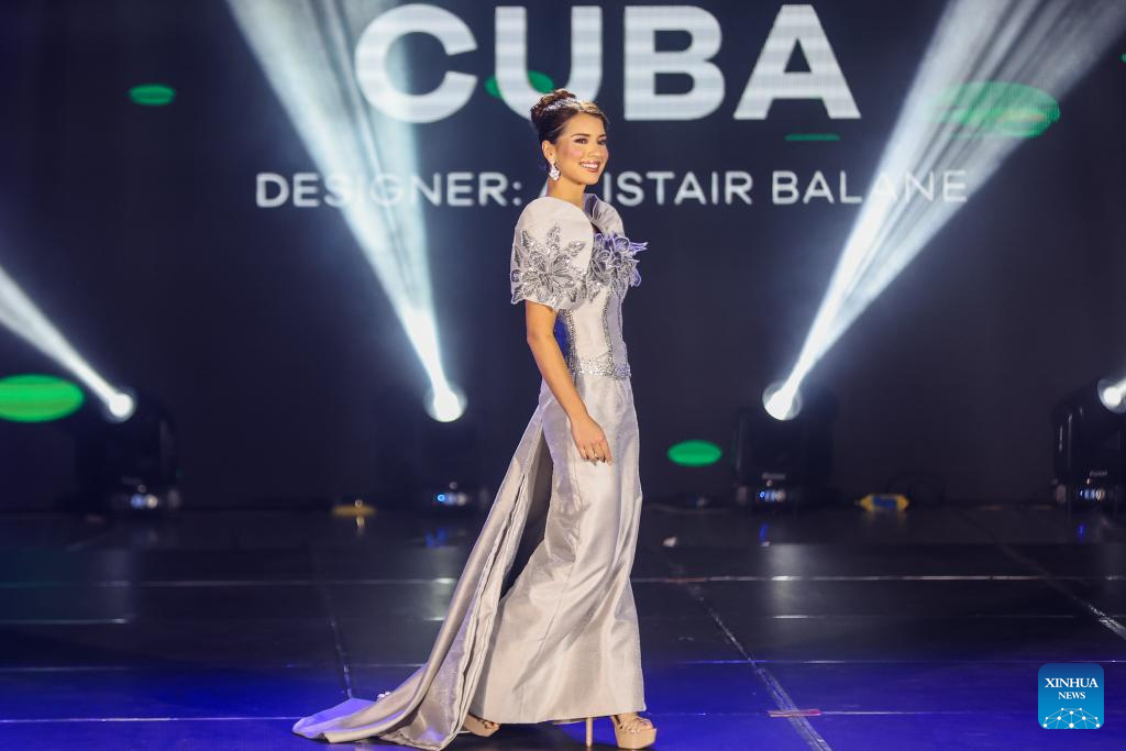 CIUDAD QUEZON, 22 octubre, 2025 (Xinhua) -- Rachel Chang, de Cuba, presenta una creación durante el Desfile de Modas del Terno Filipino de Miss Tierra 2025, en Ciudad Quezón, Filipinas, el 22 de octubre de 2025. Las candidatas a Miss Tierra 2025 de varios países participaron en el desfile de modas con vestidos confeccionados por diseñadores filipinos en celebración del 25 aniversario del certamen de belleza. (Xinhua/Rouelle Umali)