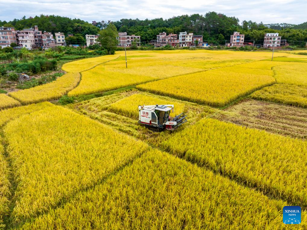 BEIJING, 23 octubre, 2025 (Xinhua) -- Vista aérea tomada con un dron del 23 de octubre de 2025 de una segadora cosechando arroz, en Wuzhou, en la region autónoma de la etnia zhuang de Guangxi, en el sur de China. El jueves se conmemora el Descenso de las Heladas. Como último término solar del otoño, el Descenso de las Heladas anuncia la llegada del invierno. (Xinhua/He Huawen)