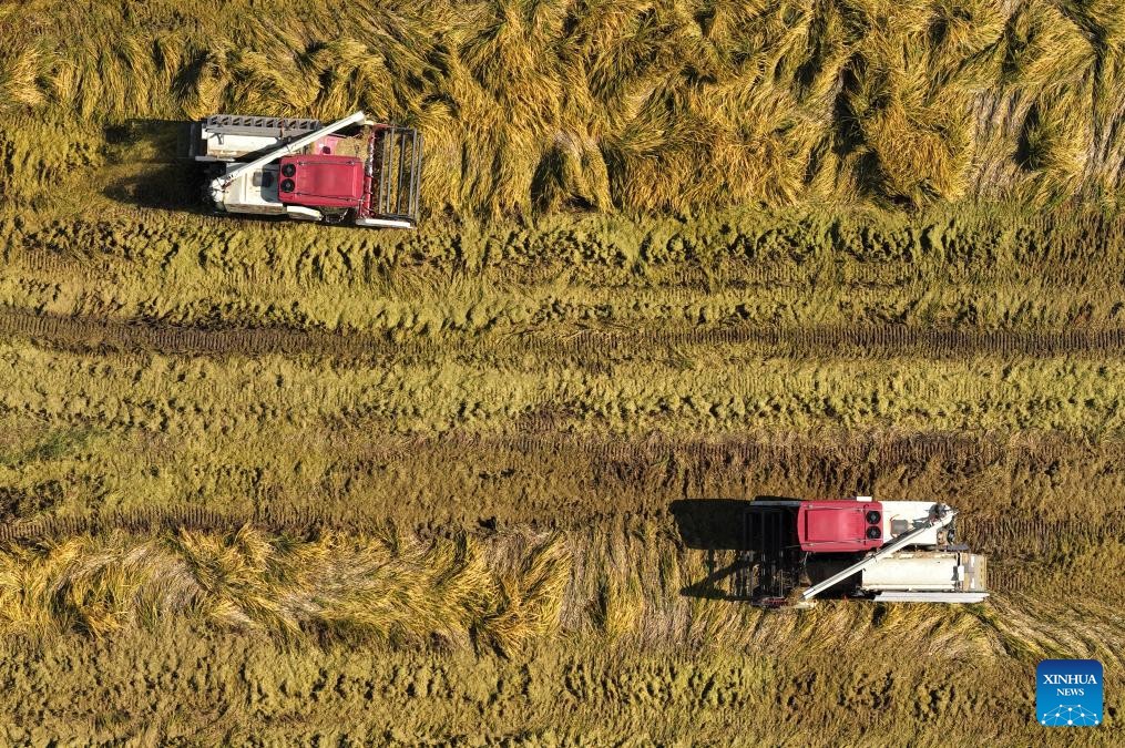 BEIJING, 23 octubre, 2025 (Xinhua) -- Vista aérea tomada con un dron del 23 de octubre de 2025 de segadoras cargando arroz cosechado, en Bozhou, en la provincia de Anhui, en el este de China. El jueves se conmemora el Descenso de las Heladas. Como último término solar del otoño, el Descenso de las Heladas anuncia la llegada del invierno. (Xinhua/Liu Qinli)