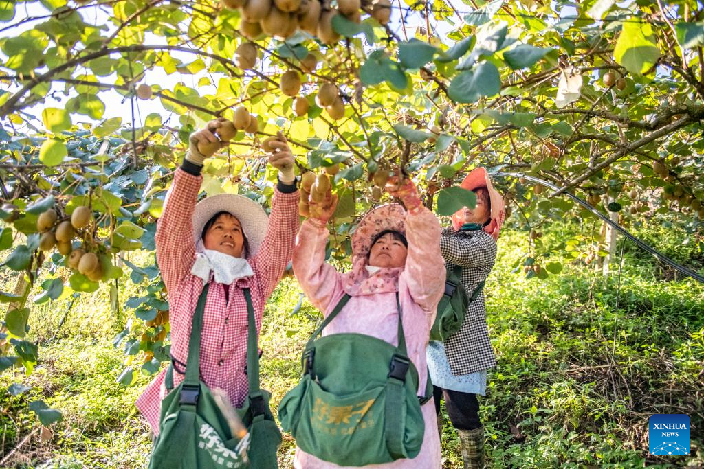 BEIJING, 23 octubre, 2025 (Xinhua) -- Agricultoras recolectan kiwis, en la prefectura autónoma zhuang y miao de Wenshan, en la provincia de Yunnan, en el suroeste de China, el 23 de octubre de 2025. El jueves se conmemora el Descenso de las Heladas. Como último término solar del otoño, el Descenso de las Heladas anuncia la llegada del invierno. (Xinhua/Xiong Pingxiang)