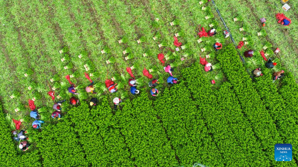 BEIJING, 23 octubre, 2025 (Xinhua) -- Vista aérea tomada con un dron del 23 de octubre de 2025 de agricultores cosechando apio, en Dongying, en la provincia de Shandong, en el este de China. El jueves se conmemora el Descenso de las Heladas. Como último término solar del otoño, el Descenso de las Heladas anuncia la llegada del invierno. (Xinhua/Liu Yunjie)