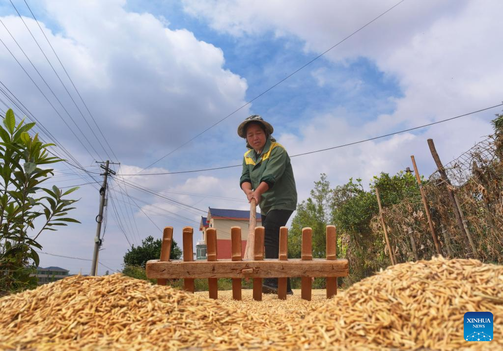 BEIJING, 23 octubre, 2025 (Xinhua) -- Imagen tomada con un dron del 23 de octubre de 2025 de un agricultor secando arroz, en Hengyang, en la provincia de Hunan, en el centro de China. El jueves se conmemora el Descenso de las Heladas. Como último término solar del otoño, el Descenso de las Heladas anuncia la llegada del invierno. (Xinhua/Cao Zhengping)