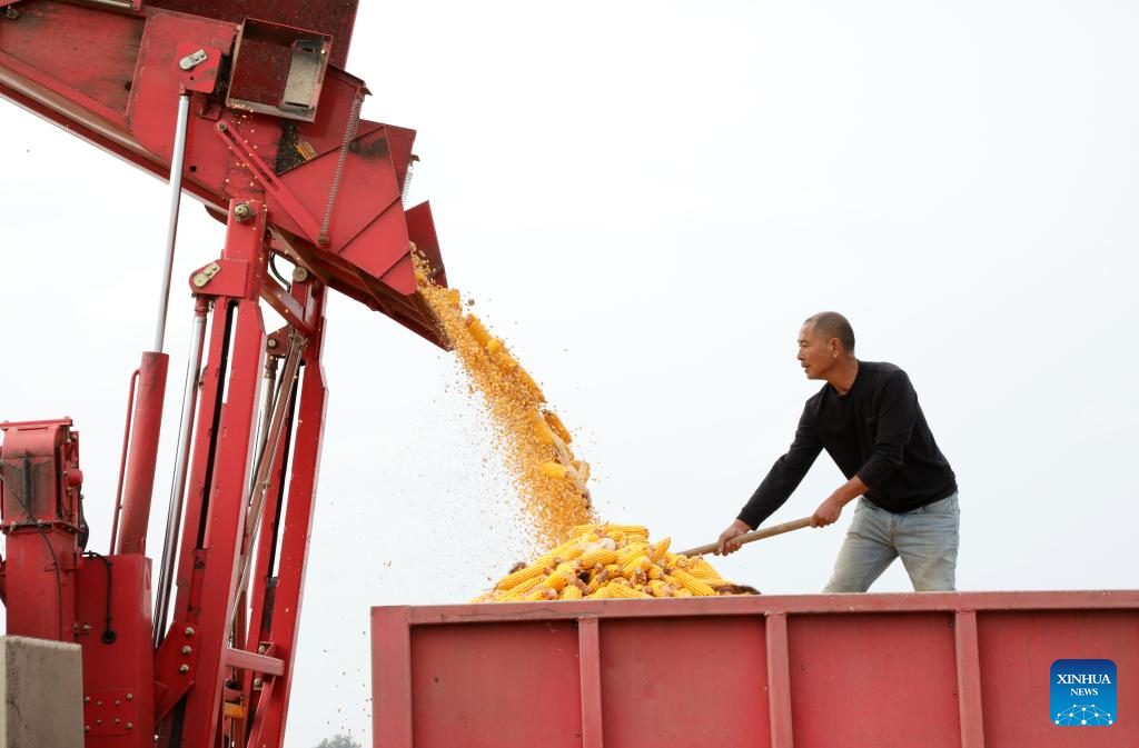BEIJING, 23 octubre, 2025 (Xinhua) -- Un agricultor trabaja con maíz cosechado, en Binzhou, en la provincia de Shandong, en el este de China, el 23 de octubre de 2025. El jueves se conmemora el Descenso de las Heladas. Como último término solar del otoño, el Descenso de las Heladas anuncia la llegada del invierno. (Xinhua/Chen Bin)