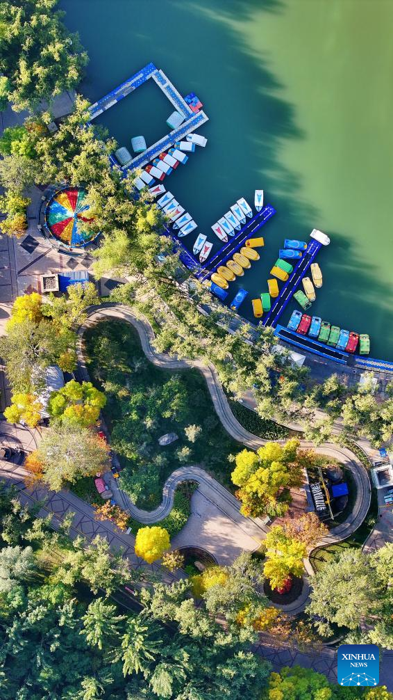 YINCHUAN, 23 octubre, 2025 (Xinhua) -- Vista aérea tomada con un dron el 13 de octubre de 2025 del paisaje otoñal del parque Haibao, en Yinchuan, en la región autónoma de la etnia hui de Ningxia, en el noroeste de China. (Xinhua/Li Jing)