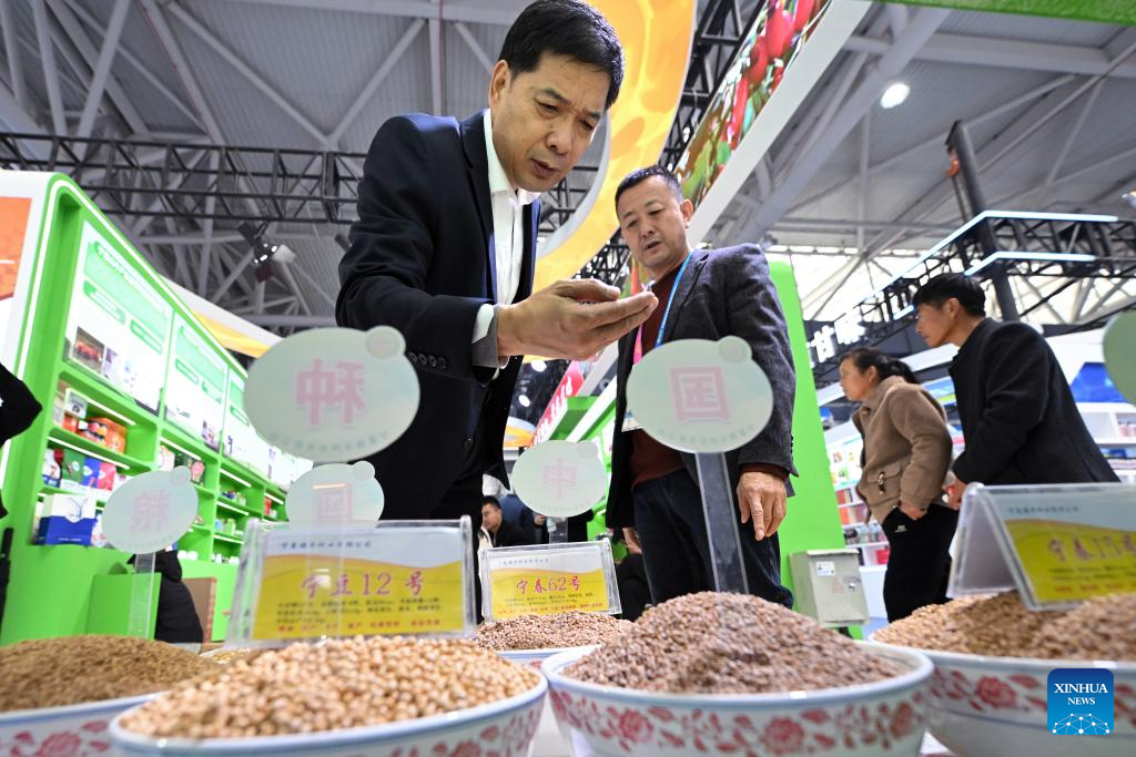 XI'AN, 25 octubre, 2025 (Xinhua) -- Visitantes aprenden sobre semillas de cultivos en la 32 Feria de Alta Tecnología Agrícola de Yangling de China, en Yangling, en la provincia de Shaanxi, en el noroeste de China, el 25 de octubre de 2025. Presentando innovaciones en logros de alta tecnología agrícola, la 32 Feria de Alta Tecnología Agrícola de Yangling de China comenzó aquí el sábado. (Xinhua/Li Yibo)
