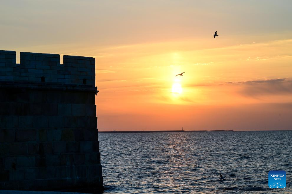 QINHUANGDAO, 26 octubre, 2025 (Xinhua) -- Imagen del 26 de octubre de 2025 del paisaje al amanecer en el punto escénico de Laolongtou, en el paso de Shanhaiguan, en la ciudad de Qinhuangdao, en la provincia de Hebei, en el norte de China. (Xinhua/Chen Yehua)