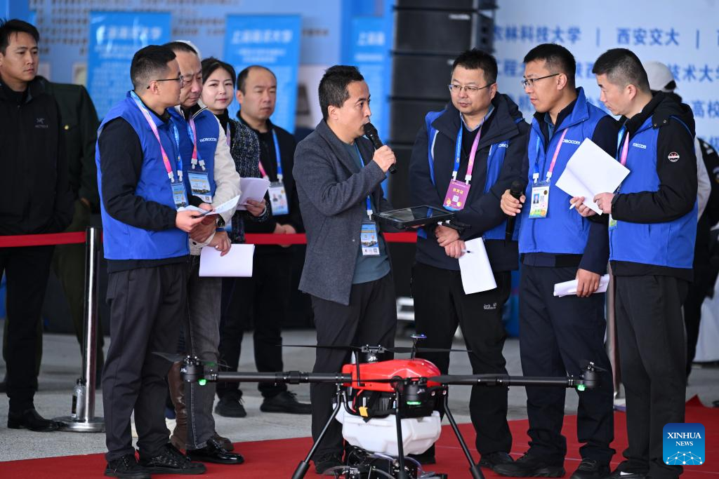 YANGLING, 26 octubre, 2025 (Xinhua) -- Un técnico presenta un dron agrícola a los jueces en una competencia para robots agrícolas durante la 32ª Feria de Alta Tecnología de Yangling de China, en Yangling, en la provincia de Shaanxi, en el noroeste de China, el 26 de octubre de 2025. La feria de alta tecnología agrícola comenzó aquí el sábado, destacando una competencia para robots agrícolas así como una exposición en maquinaría agrícola inteligente. (Xinhua/Li Yibo)