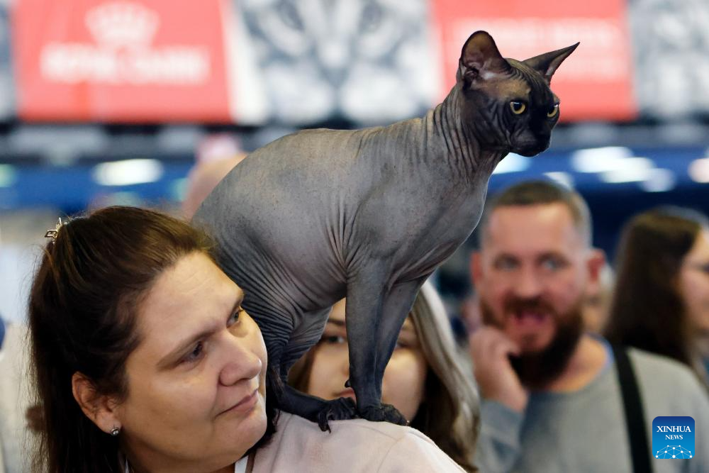 BUCAREST, 26 octubre, 2025 (Xinhua) -- Imagen del 25 de octubre de 2025 de un gato esfinge siendo evaluado durante el campeonato felino de la Exposición Mundial de Rumanía 2025 en Romexpo, en Bucarest, Rumania. Más de 1.000 gatos de más de 30 países participaron en el concurso de belleza felina, que duró dos días. (Xinhua/Cristian Cristel)