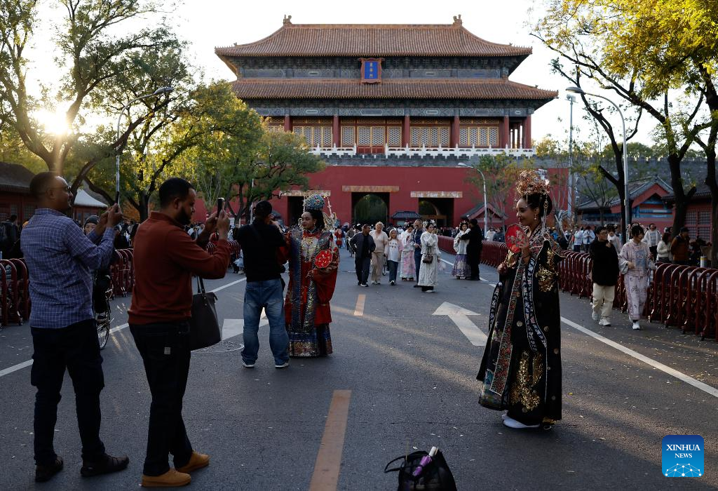 BEIJING, 1 noviembre, 2025 (Xinhua) -- Turistas portan trajes tradicionales chinos mientras caminan frente a la Puerta Donghua, conocida como Puerta de la Gloria del Este, en Beijing, capital de China, el 1 de noviembre de 2025. (Xinhua/Wang Lili)