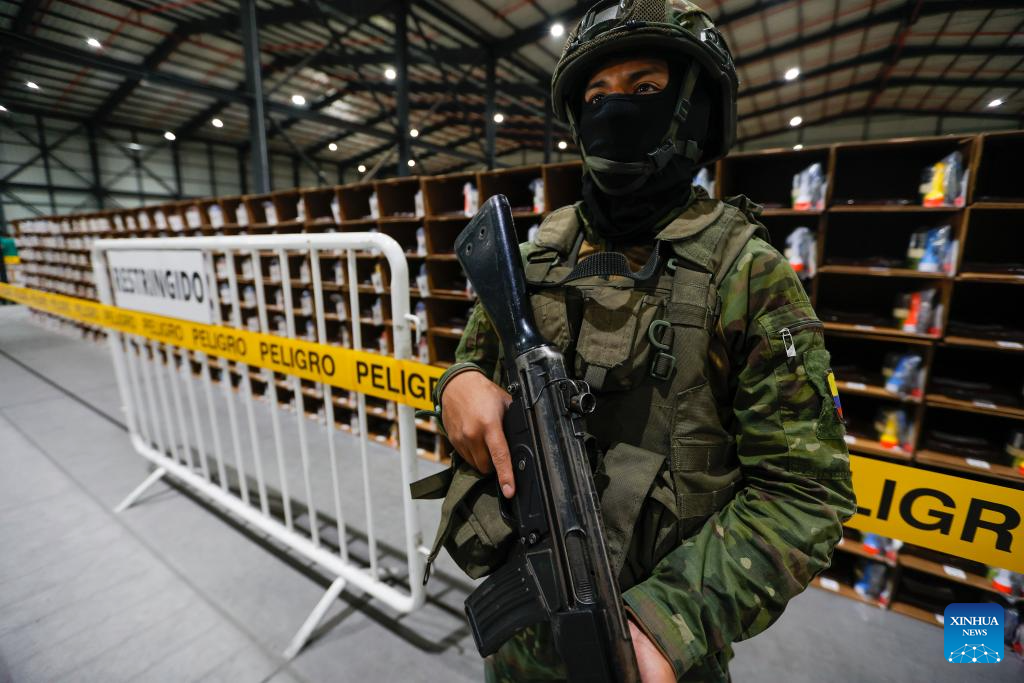 QUITO, 3 noviembre, 2025 (Xinhua) -- Un militar vigila durante la presentación de los avances logísticos para el próximo proceso electoral, en las instalaciones de la empresa integradora Montgar, en la localidad de Pifo, en el extremo nororiental de Quito, Ecuador, el 3 de noviembre de 2025. El Consejo Nacional Electoral de Ecuador avanza en el proceso de armado y distribución de los paquetes electorales que se utilizarán en la consulta popular y el referendo constitucional convocados por el Gobierno para el próximo 16 de noviembre, informó el lunes la presidenta del organismo, Diana Atamaint. (Xinhua/Ricardo Landeta)