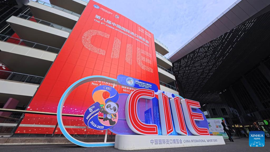 SHANGHAI, 3 noviembre, 2025 (Xinhua) -- Imagen del 3 de noviembre de 2025 de una decoración temática de la Exposición Internacional de Importaciones de China (CIIE, por sus siglas en inglés), en el Centro Nacional de Exposiciones y Convenciones (Shanghai), en Shanghai, en el este de China. La VIII CIIE se celebrará en Shanghai del 5 al 10 de noviembre. (Xinhua/Fang Zhe)
