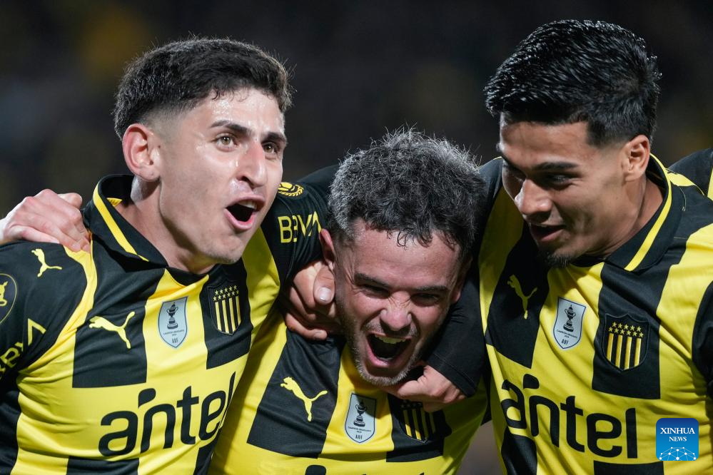 MONTEVIDEO, 3 noviembre, 2025 (Xinhua) -- Imagen del 2 de noviembre de 2025 del jugador Lucas Hernández (c), de Peñarol, festejando su anotación junto a sus compañeros durante el partido correspondiente al Torneo Clausura del Campeonato Uruguayo de Fútbol ante Defensor Sporting, celebrado en el Estadio Campeón del Siglo, en Montevideo, capital de Uruguay. (Xinhua/Nicolás Celaya)