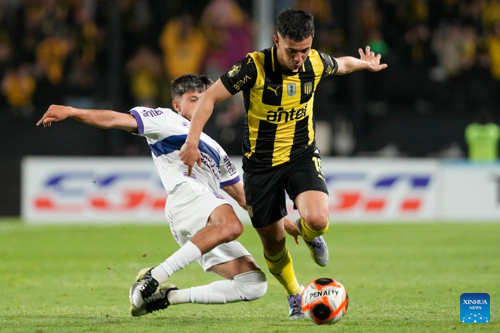 MONTEVIDEO, 3 noviembre, 2025 (Xinhua) -- Imagen del 2 de noviembre de 2025 del jugador Leonardo Fernández (d), de Peñarol, disputando el balón con Nicolás Wunsch (i), de Defensor Sporting durante el partido correspondiente al Torneo Clausura del Campeonato Uruguayo de Fútbol, celebrado en el estadio Campeón del Siglo, en Montevideo, capital de Uruguay. (Xinhua/Nicolás Celaya)