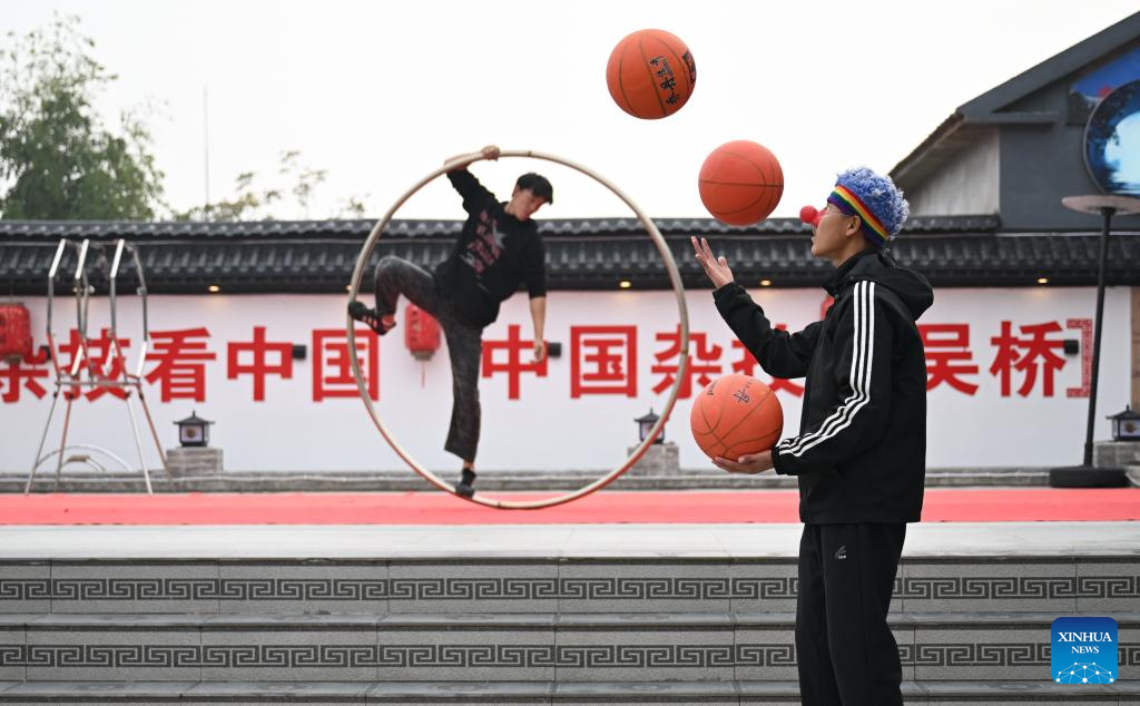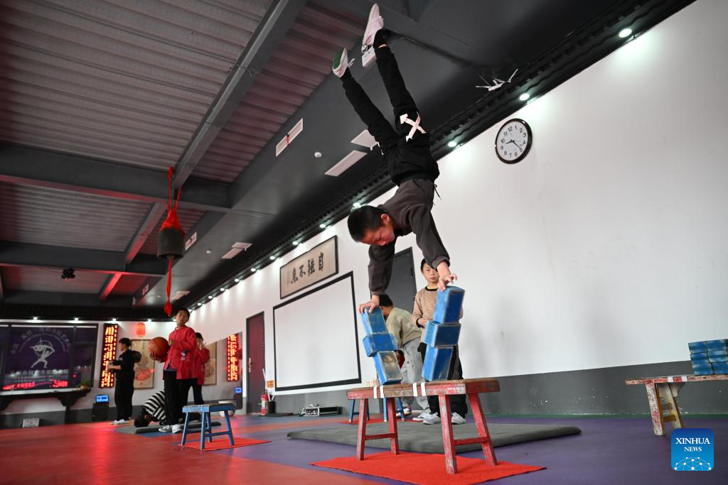 CANGZHOU, 3 noviembre, 2025 (Xinhua) -- Imagen del 28 de octubre de 2025 de estudiantes practicando acrobacias en un patio acrobático situado a lo largo de una carretera de terraplén del Gran Canal, en el distrito de Wuqiao de Cangzhou, en la provincia de Hebei, en el norte de China. El Gran Canal, que conecta Beijing, en el norte de China, con la ciudad de Hangzhou, en el este del país, tiene más de 2.500 años de historia y es conocido como la vía fluvial artificial más larga del mundo. A lo largo del tramo de Cangzhou se ha construido una carretera con terraplén que se extiende a lo largo de 308 kilómetros y conecta más de 300 aldeas de toda la ciudad. (Xinhua/Mu Yu) (oa) (ah) (ce)