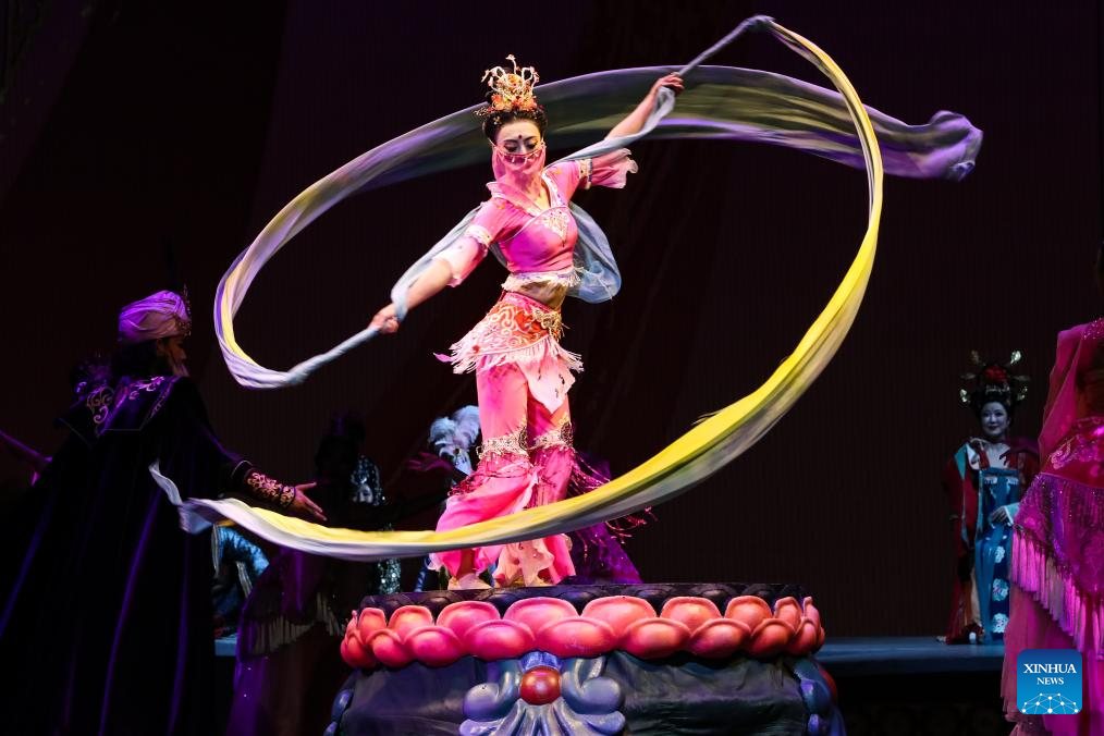 LANZHOU, 4 noviembre, 2025 (Xinhua) -- Imagen del 20 de septiembre de 2025 del drama de danza "Flores Llueven a lo largo de la Ruta de la Seda" siendo presentado en el Teatro de Dunhuang, en Dunhuang, en la provincia de Gansu, en el noroeste de China. La danza Dunhuang se refiere a un estilo de danza que tiene como objetivo dar vida a las figuras icónicas representadas en los antiguos murales de las Grutas de Mogao. Inspirándose en temas históricos, artistas contemporáneos han creado obras maestras de música y danza, como el clásico drama de danza "Flores Llueven a lo largo de la Ruta de la Seda", y "Bodhisattva de las Mil Manos". (Xinhua/Lang Bingbing)