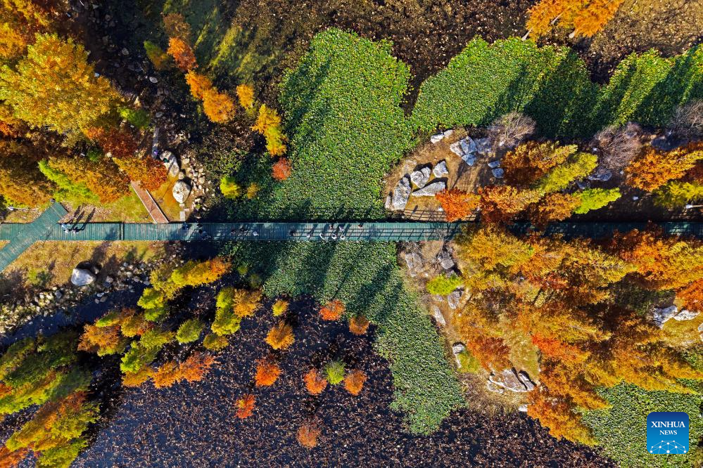 BEIJING, 5 noviembre, 2025 (Xinhua) -- Vista aérea tomada con un dron el 5 de noviembre de 2025 de personas visitando un parque de humedales, en la ciudad de Yantai, en la provincia de Shandong, en el este de China. (Xinhua/Sun Wentan)