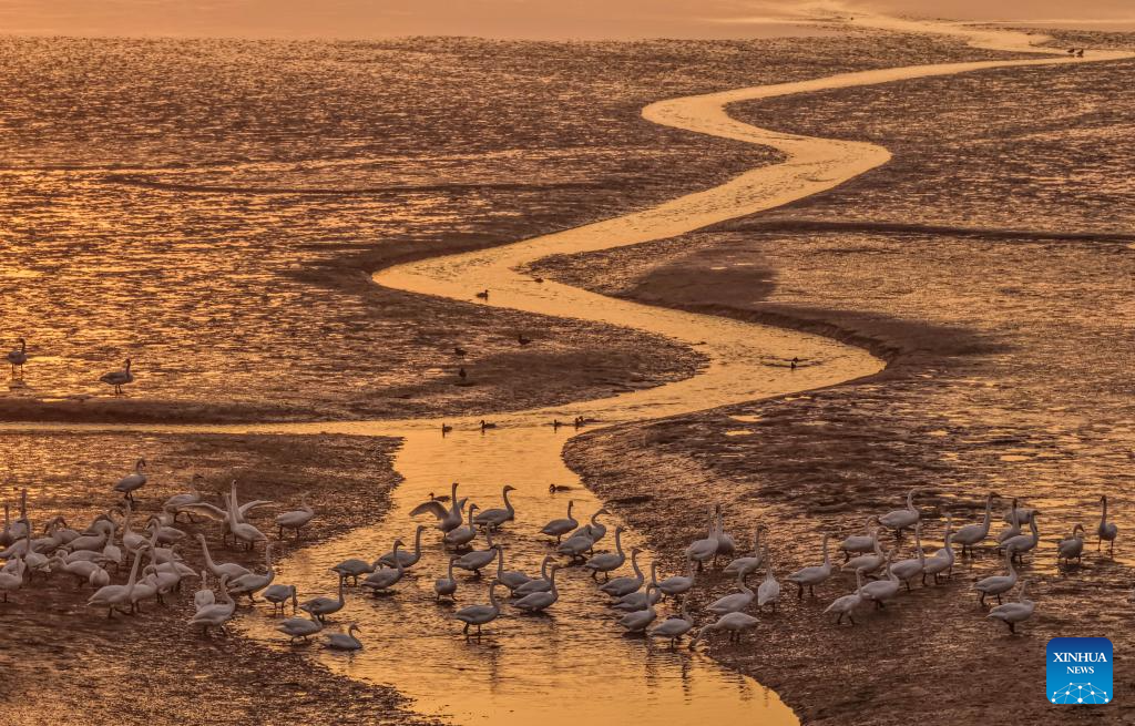 BEIJING, 5 noviembre, 2025 (Xinhua) -- Vista aérea tomada con un dron el 5 de noviembre de 2025 de cisnes alimentándose en una reserva natural, en la ciudad de Rongcheng, en la provincia de Shandong, en el este de China. (Xinhua/Li Xinjun)